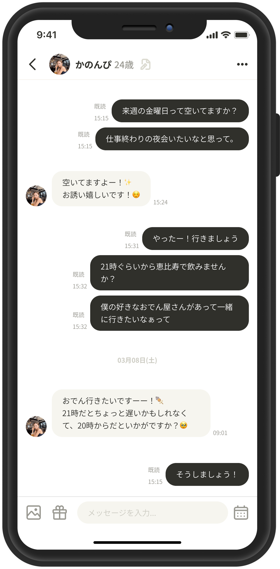 お好みのキャストと直接メッセージでやりとりし、2人きりの予定を立てることができます。